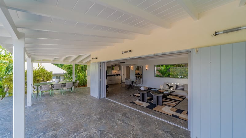 Villa Emotion is a four-bedroom property with a swimming pool nestled in the wooded hills, overlooking St-Jean Bay. Located in the Tourterelles district, Villa Emotion offers beautiful and very private spaces in a most relaxing atmosphere. Set in tropical beauty, the vacation villa rental Emotion is the perfect place for an unforgettable eight-person stay in St-Barths. Designed with one main building and two bungalows, Villa Emotion welcomes guests into bright and comfy spaces. The air-conditioned living room opens onto the large terrace and features a sofa and a coffee table overlooking the hills, as well as an HD screen. On the large marble-tile floor, the indoor dining room accommodates guests to dine in a quiet atmosphere, next to the stainless-steel kitchen well equipped to cook delicious meals or to call upon a private chef. Large windows let the natural light come in, for exquisite and dreamy moments marvelling at the fantastic nature of the Caribbean. At the front of Villa Emotion, the terrace offers beautiful spaces for relaxing sessions, in the heart of an environment illuminated by the translucent waters of Saint-Jean Bay. Under the covered area, you’ll find the al fresco dining room. A few steps down on the wooden deck, the swimming pool sparkles under the Caribbean sunshine in a lovely ambiance with cushion-covered deckchairs, an outdoor lounge with armchairs a coffee table, and parasols. Below the bungalows, the green lawn makes the villa's outdoor spaces even more fabulous, bringing a breath of freshness and green charm for a poetic and romantic stay in St-Barths. Villa Emotion features four air-conditioned bedrooms with king-size beds, televisions, en-suite bathrooms and outdoor showers. Two of these are located in bungalows on the right-hand side of the main building and open onto views over the garden and the crystal-clear waters of Saint-Jean Bay in the background. The other two bedrooms are on the left-hand side of the living room and open onto the terrace with a swimming pool. The bedrooms are finely decorated, in a soothing, bright and comfy atmosphere. Close to Saint-Jean beach, the holiday villa rental Emotion is the ideal location for a luxurious stay for eight people in Saint-Barths.