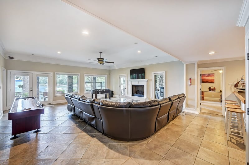 Welcome to Lakeside Harmony, a spacious, waterfront haven designed with large families in mind, from great-grandparents to the littlest lake lovers. Located in Mooresville and nestled on the shimmering shores of Lake Norman's main channel, this 8,000 sq ft property offers everything you need for the ultimate lakeside getaway. With 9 lakeview bedrooms, 3 full kitchens, 6 full bathrooms, 2 half baths, and an adorable boathouse apartment, there's space and comfort for everyone---up to 28 guests. Whether you're gathering for a reunion, celebrating a milestone, or simply enjoying time together, this home offers both room to connect and space to unwind. Inside, you'll find an inviting blend of casual luxury and comfort. The main level features a large chef's kitchen, fully stocked for preparing everything from pancake breakfasts to full holiday feasts. Gather around the breakfast bar (seats 6) or the eat-in nook (seats 8) for casual meals, or dine together in the formal dining room with seating for 8. After dinner, the living room invites you to relax on the oversized leather sectional while taking in stunning lake views or watching a movie on the wall-mounted TV. Step outside to the expansive covered porch that runs the length of the house---perfect for sipping morning coffee or enjoying evening cocktails. There's ample seating, a propane grill ready for lakeside cookouts, and front-row views of those unforgettable Lake Norman sunsets. Downstairs, the fun continues in the game room, fully stocked with air hockey, shuffleboard, and classic video games---a hit for all ages. This level also includes a second full kitchen, a bar area, a TV lounge, and two king bedrooms with en suite baths, offering convenience and privacy. All together, the retreat features seven king bedrooms, one queen room, and a massive bunk room made just for the kids. The bunk room sleeps 10+, with a twin-over-full bunk, four full beds with trundles, and two daybeds, plus a cozy TV area and gaming setup that's sure to be their favourite hangout spot. And then there's the Boathouse Apartment---a beautifully renovated, private gem located right on the dock. This charming space includes its own kitchen, full bath, king bedroom, and cozy living area with a TV. It's the ultimate peaceful retreat for early risers or honeymooners in the group! The outdoor space is what truly sets this home apart. Step outside the lower level and find yourself just feet from the lake, with a hot tub, multiple seating areas, and a spacious dock perfect for sunbathing or launching a kayak or paddleboard (both included, along with life jackets). The yard features family favorites like cornhole and giant Connect Four, making it easy to spend your days enjoying the sunshine and each other's company. Whether you're gathered around the grill, sharing stories by the water, or winding down with a glass of wine as the sun sets over the lake, Lakeside Harmony is the kind of place where memories are made year after year.